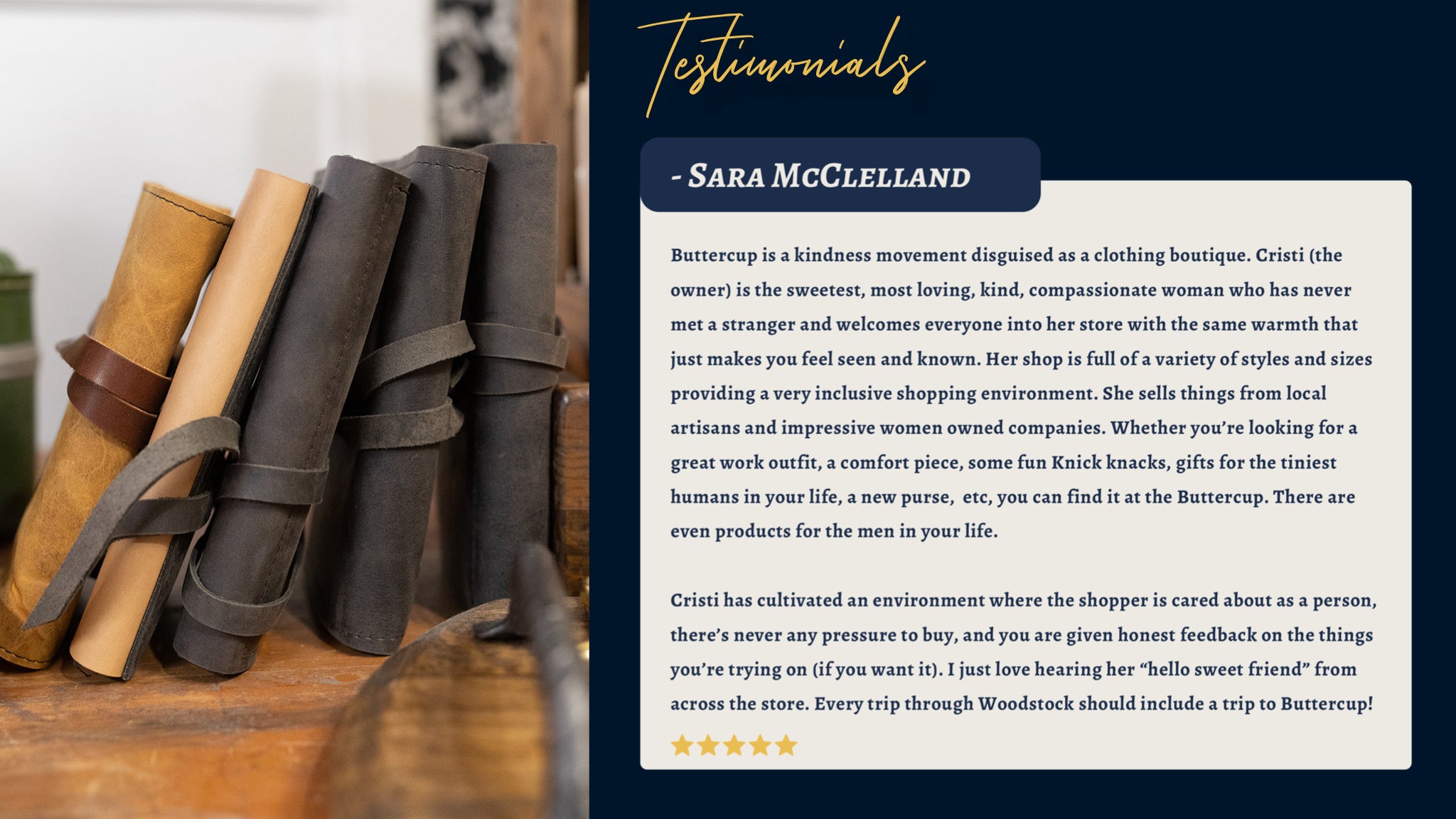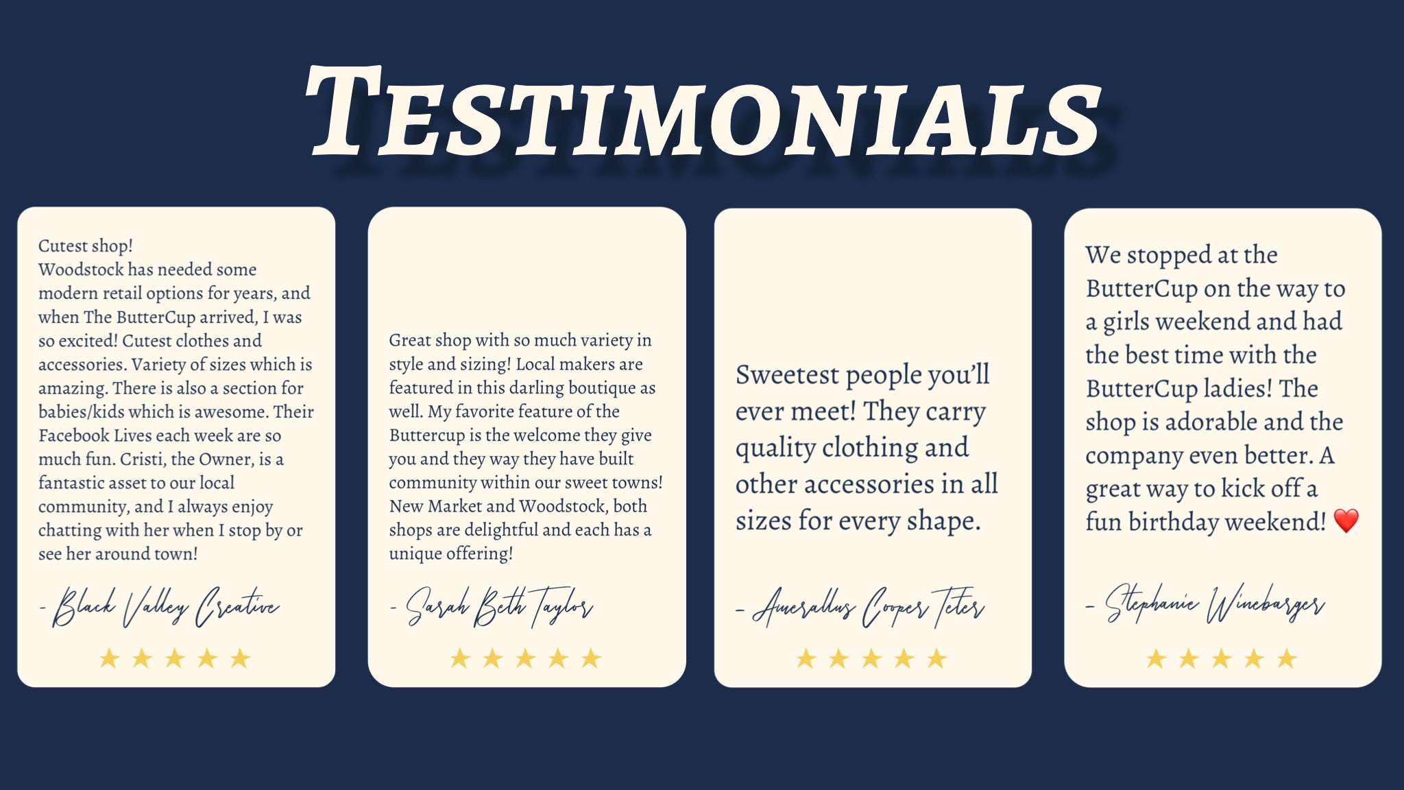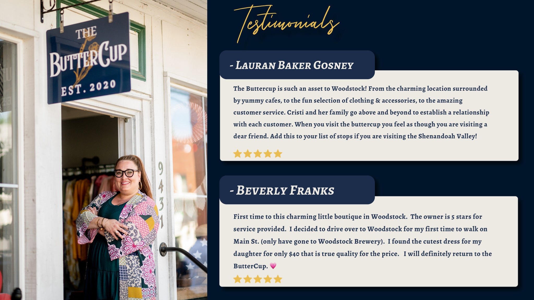 After two decades of living on the West Coast, Cristi was called back to Virginia to be closer to family. Upon her return to the Shenandoah Valley, Cristi felt a pull in her heart for something more. Deciding to let go of her fears, step beyond herself, her comfort zone & chase her dreams, Cristi opened the first ButterCup location on Congress Street in New Market, Virginia on Small Business Saturday in November 2020. As a result of the communities love & support, Cristi opened a second location exactly one year later on Main Street in Woodstock, Virginia. Female owned & operated with a staff of 8, the ButterCup is truly a love letter to her family, friends & the individuals who mentored her along the way.